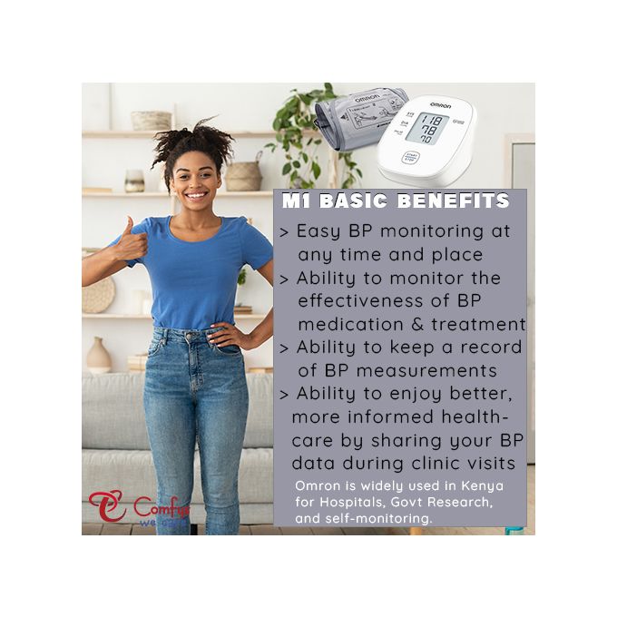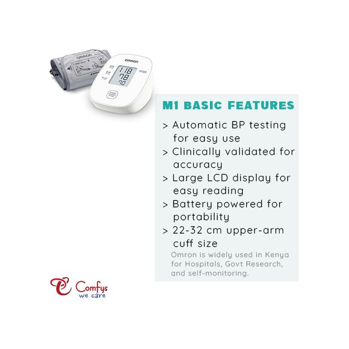 The Omron M1 Basic Blood pressure monitor Kenya is designed to make blood pressure home-monitoring easy. It is small, light and easy to carry, automatic for easy operation, and applies IntelliSense technology to prevent upper-arm discomfort when inflating the cuff for a BP Measurement. It uses AA batteries which are readily available in shops and supermarkets.